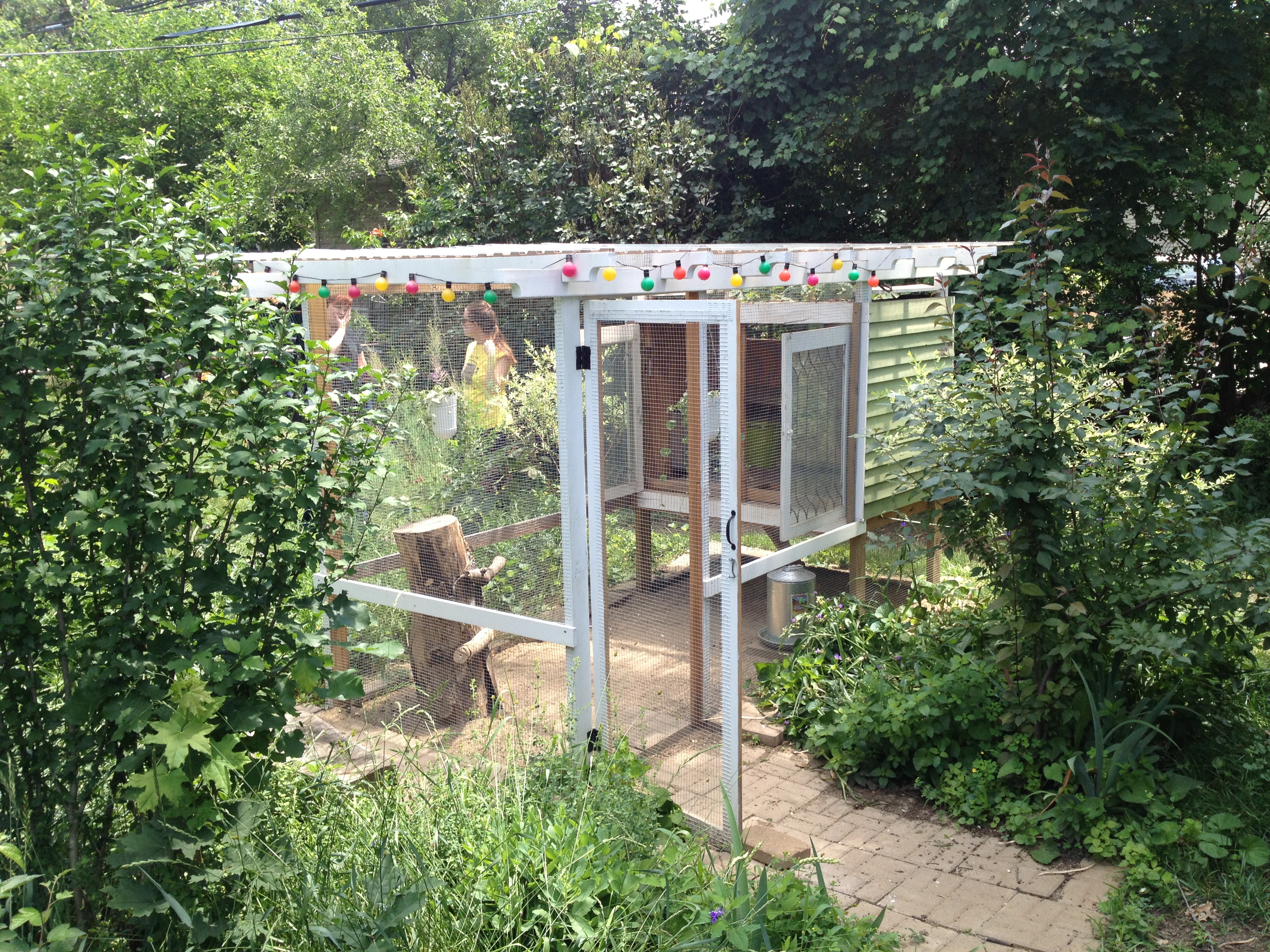 Today Matt and I visited Laura’s yard, and met her three hens. She was kind enough to show off the coop, explain how she built it and tell us what she would do differently if she had another chance. We learned about how to keep water from freezing in the winter, the kind of floor cover that works well in a coop and saw the hens take a dust bath. We plucked tart cherries from a tree and giggled as the hens scrambled for a treat.