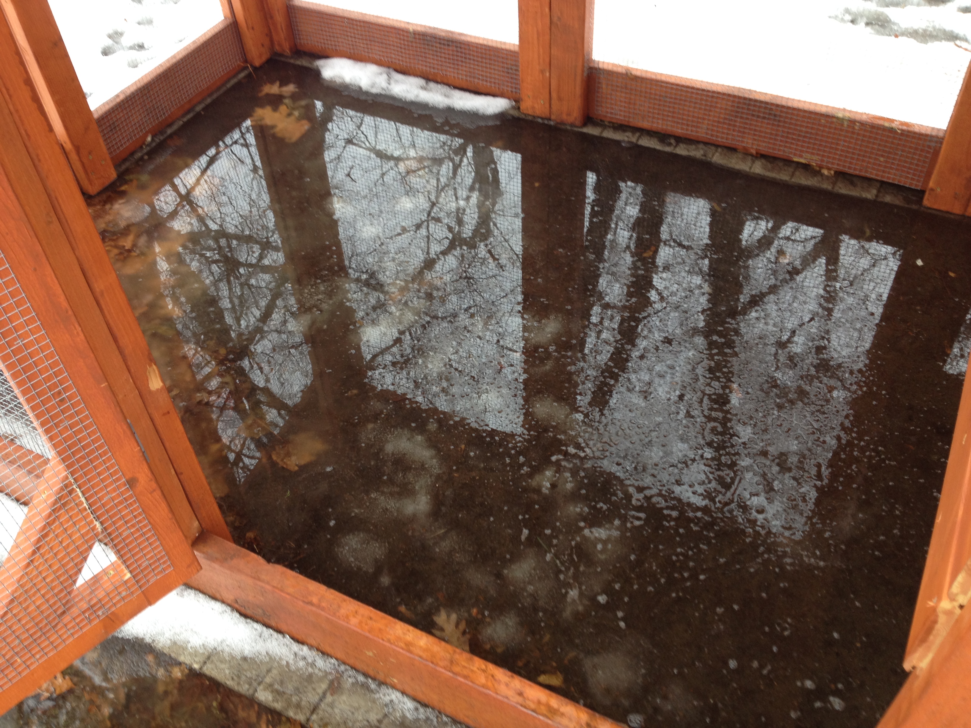 When we walked out to the coop to take final measurements, we were met with a flood in the run. As the weather warmed, bringing rain storms to melt the foot of snow out back, it transformed our yard into a swimming pool. We measured 3 inches (!) in the run alone.