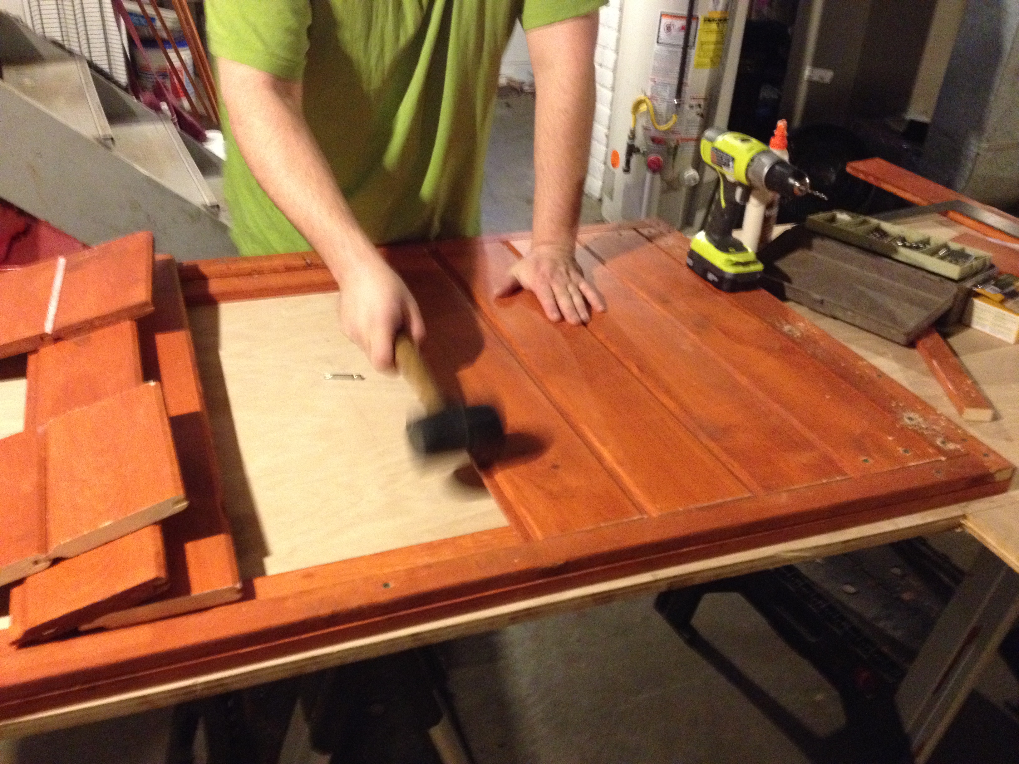 So today we went about putting it all together. We build a basic frame out of 1×4 wood, then reinforced the frame with 1×2 wood. Then we laid in tongue-and-groove pieces that we stained last night. Matt cut some pieces shorter to accommodate a window. I helped by putting in the screws.