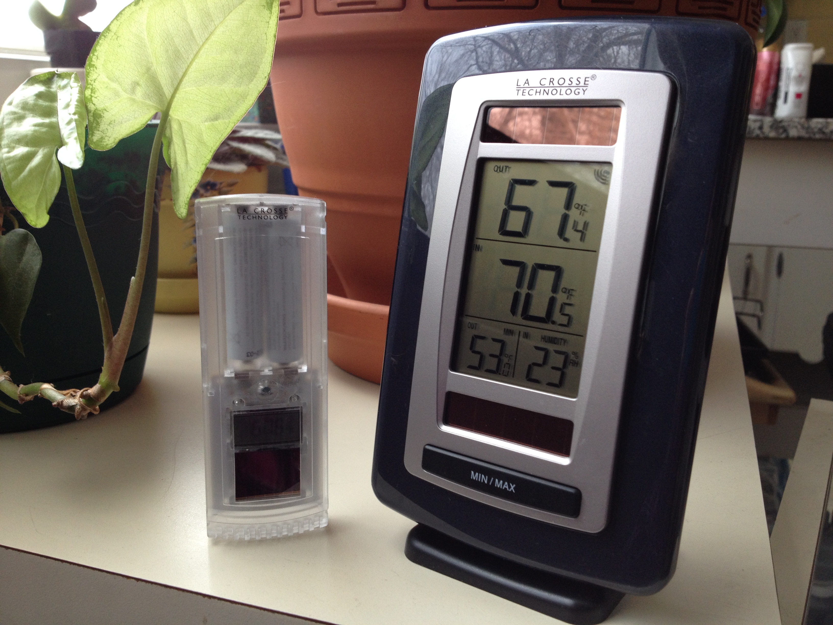 In the end, the La Cross weather station will still come in handy. Since it works fine in the house, I plan on using it to monitor the temperature of the brooder once we get chicks. The temperature (with the help of a heat lamp) will be at 95 degrees the week we bring them home, then reduce in 5-degree increments weekly until they are ready to go outside (around 70 degrees).