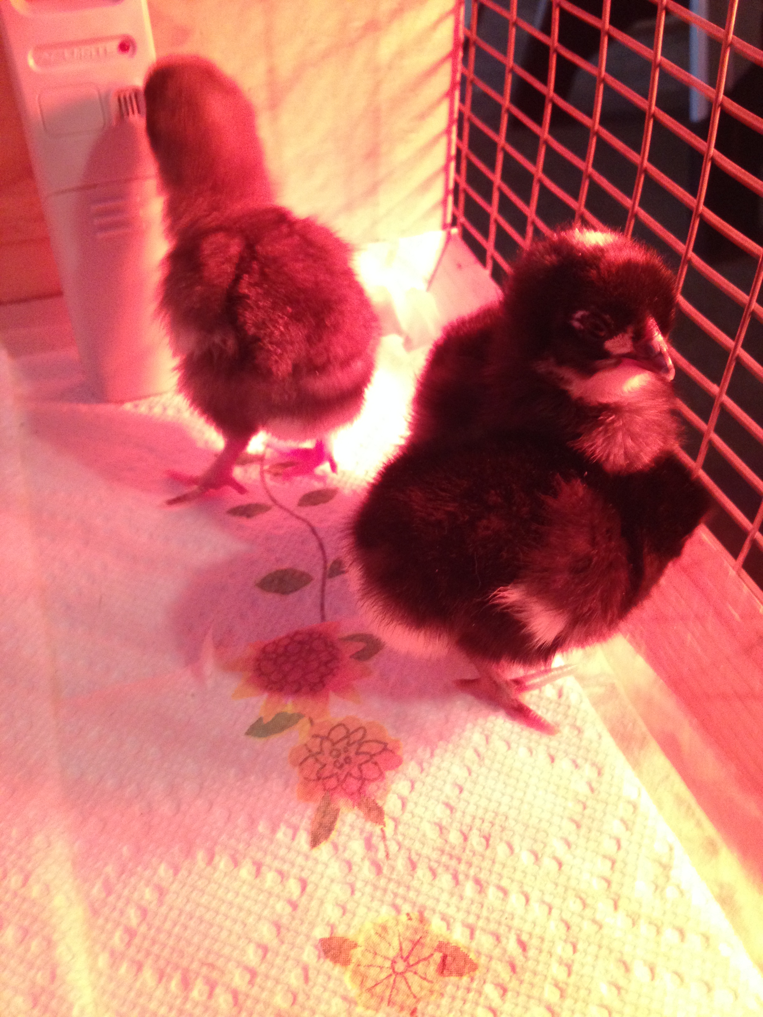 We got three chicks: a Black French Copper Marans, a Dominique and an Olive Egger. I think I’ve figured out the Olive Egger, but the others look too similar to figure them out right now. When we lifted the lid, they were huddled on top of a warming pad, a ball of fluff.