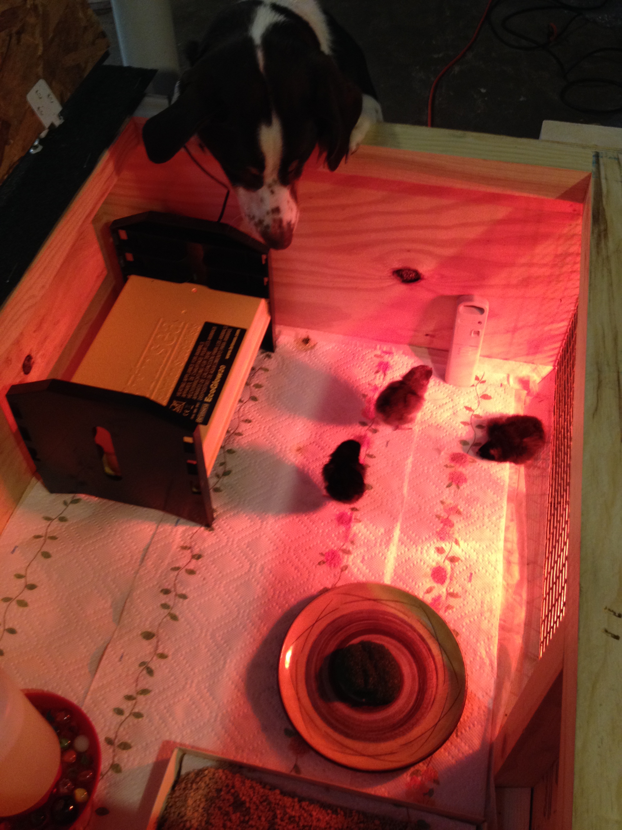 1. Hi Anne! We are having a similar issue with our dog, Charlie. The chicks are safe in their brooder, but Charlie goes down and just howls. He doesn’t know what to make of it. We did give him a chance to sniff one of the chicks, but I would advise against it (especially while the chicks are so young!). From what I’ve read, I think it will be much safer to introduce them once the birds are bigger. I think the exposure for now is good, though. Charlie can sniff away, and not harm them.