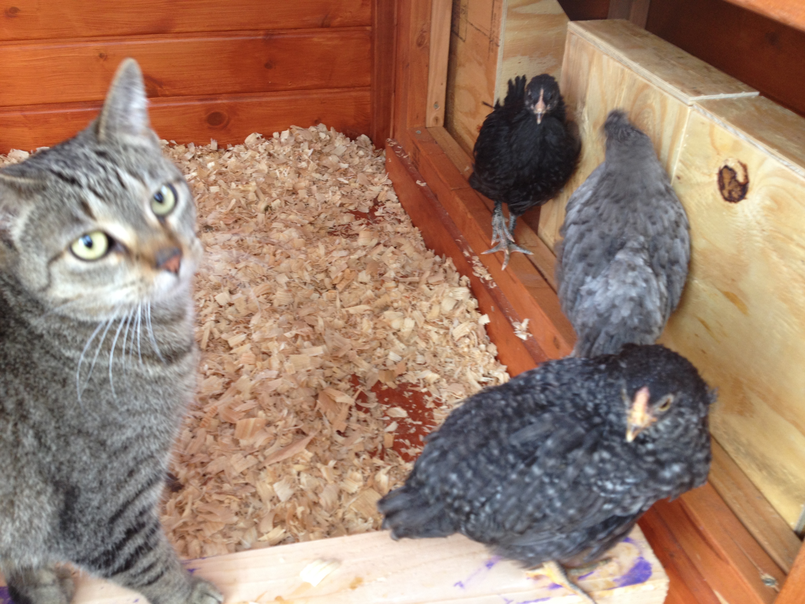 Right now, the chicks are still in the hen house. I don’t think they have figured out the ramp yet. I saw them walk up and down a few times yesterday, but they seem to be confused by it this morning.