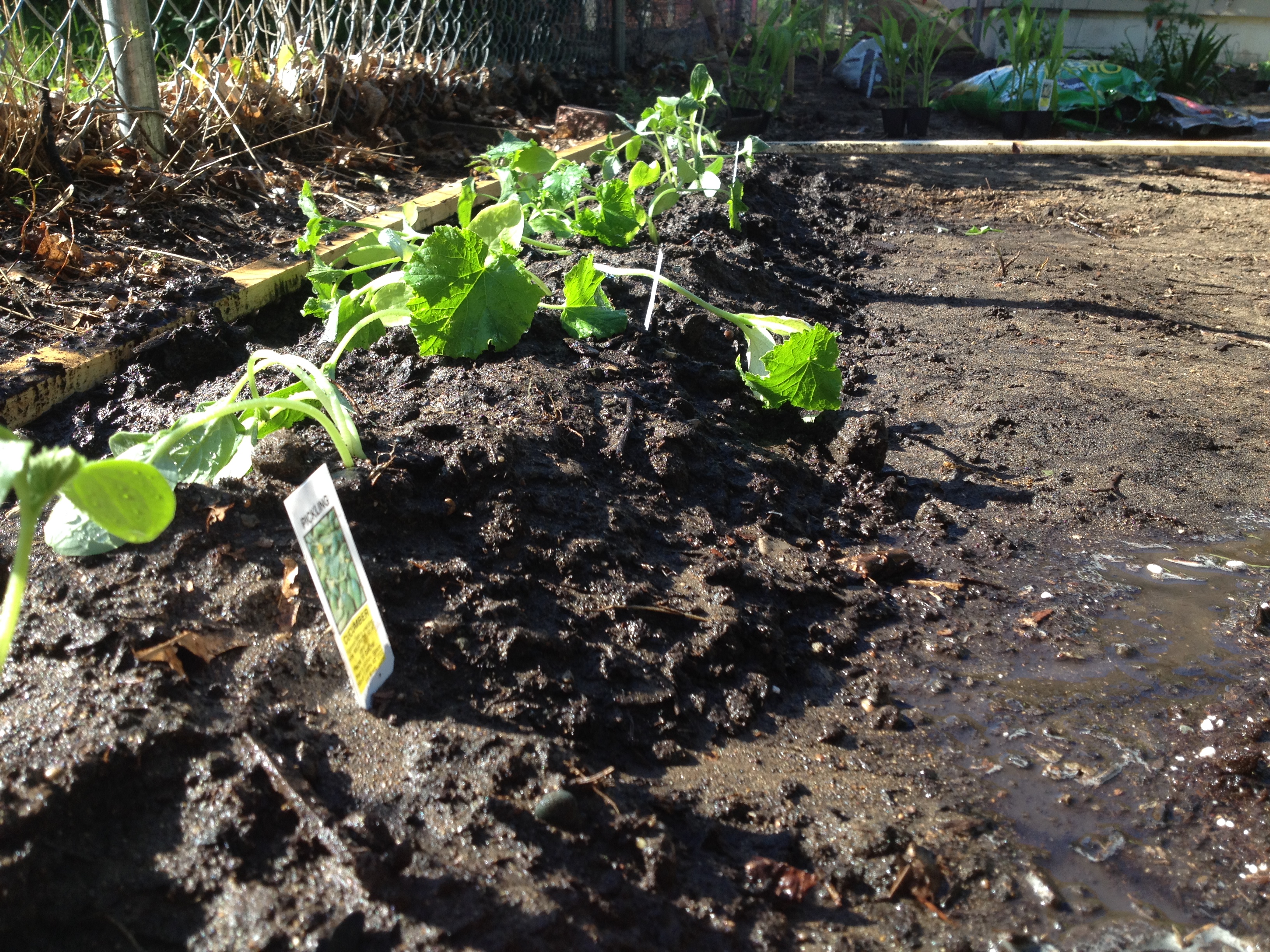 We built two trellises, one for three kinds of cucumbers and the other for pole beans. The process was swift: Matt turned the soil, added manure and raked, then I crawled through the dirt on my hands and knees planting everything. After getting caked in mud and achey-breaky knees, I made a trip to the store to pick up real gardening gloves, gardening clogs and a pad to kneel on. Rookie mistake!