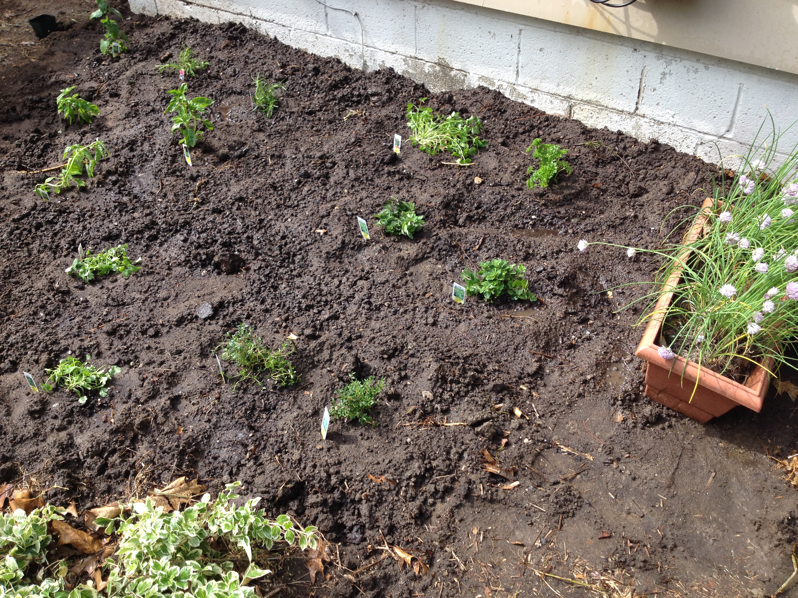 Our herb garden has basil, cilantro, rosemary, parsley, chamomile, catnip, oregano, thyme, garlic and chives.