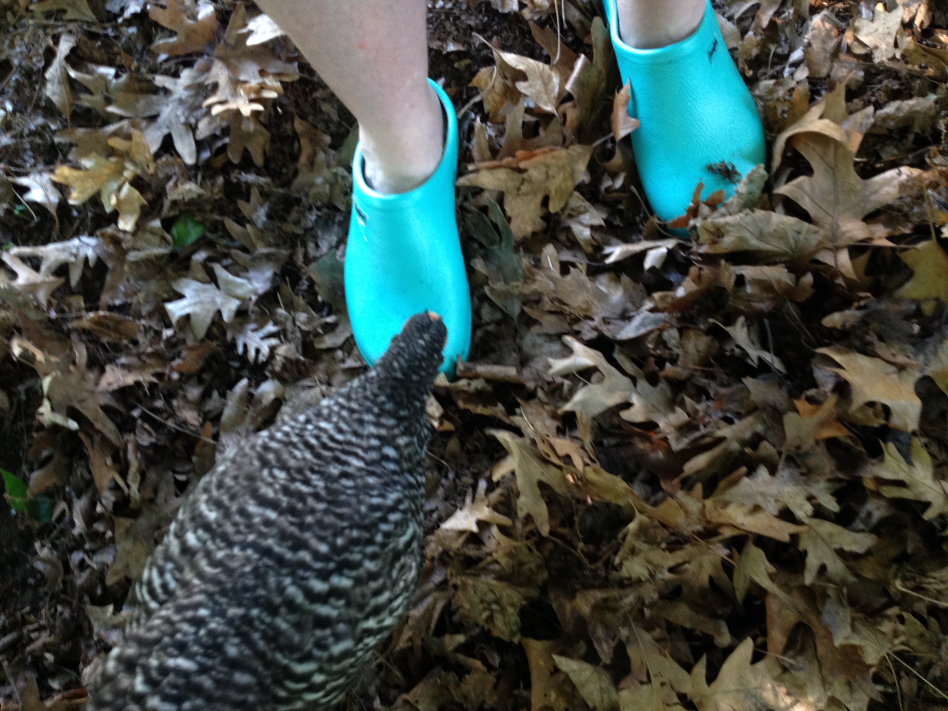 Startled, I looked down at my feet to see Nellie pecking away at my turquoise gardening shoe.