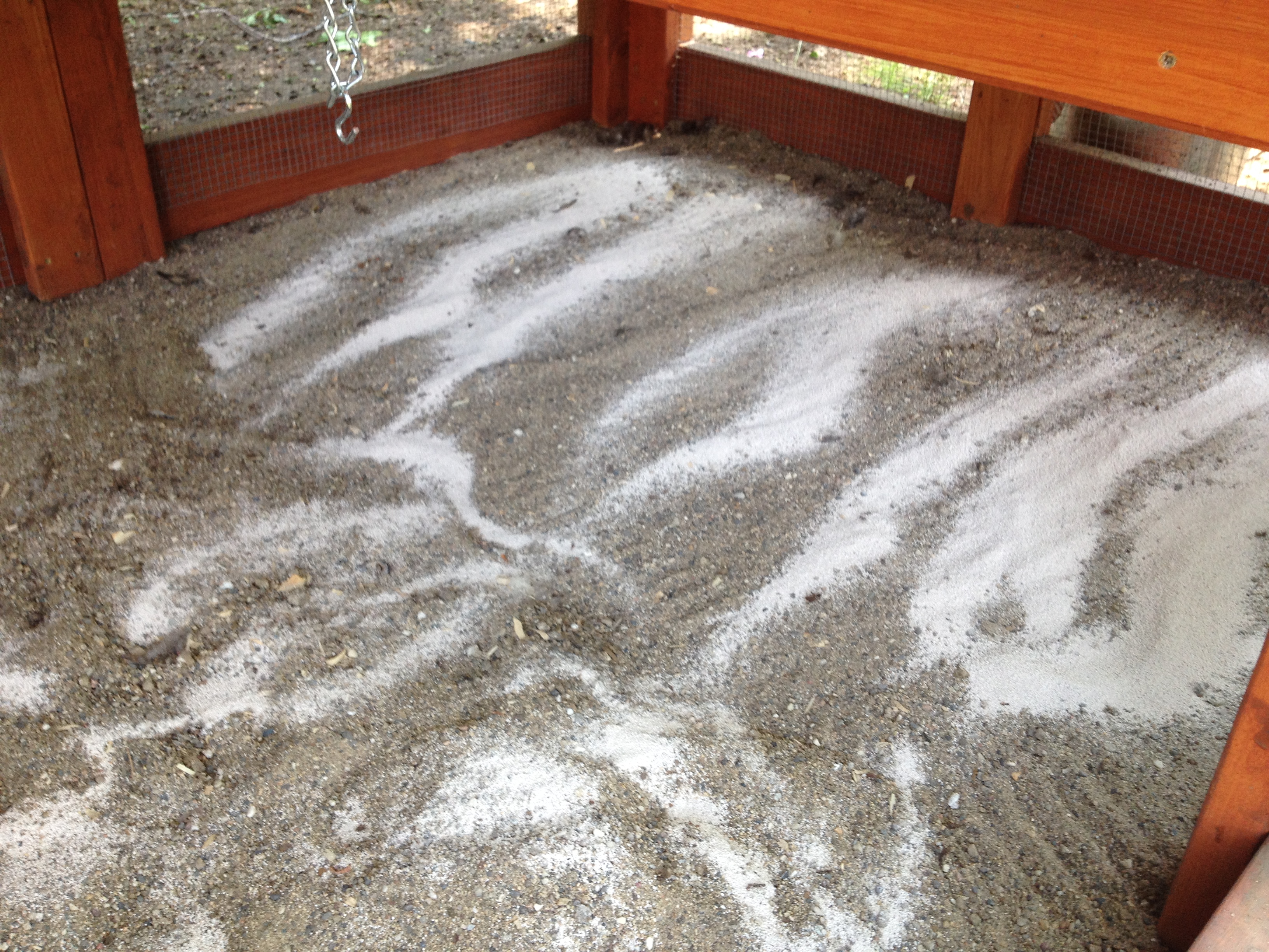 The PDZ directions said to use 6 cups on the first application, then 1-3 cups for maintenance. So I used a coffee mug to spread six cups of the powder on top of the freshly cleaned coop sand. Next, I used a metal rake to mix it into the sand.