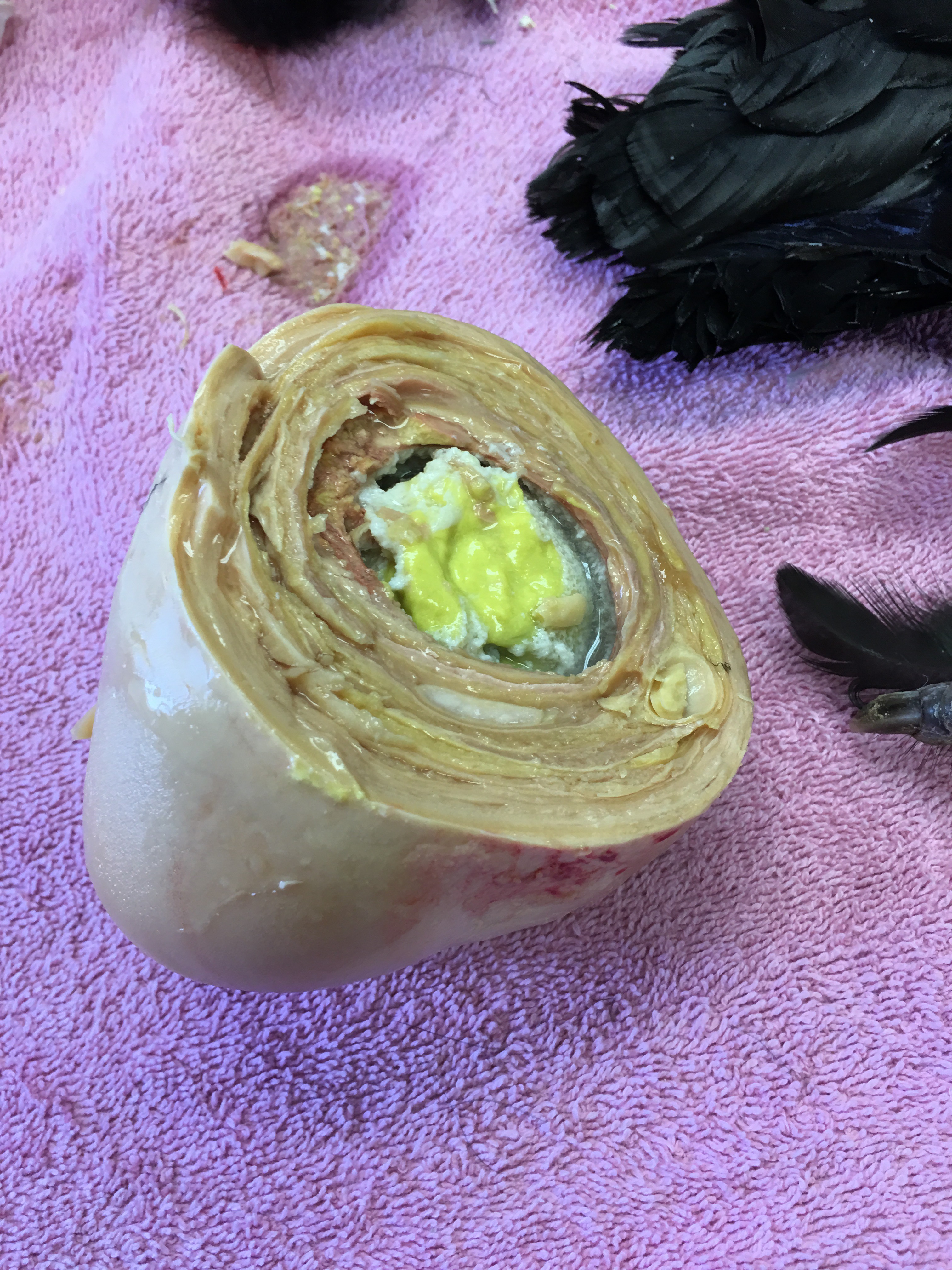 After opening Loretta, he pulled out a large yellow mass. Apparently Loretta had an egg that never passed, then yolks dropped on it creating layers upon layers around the original egg.